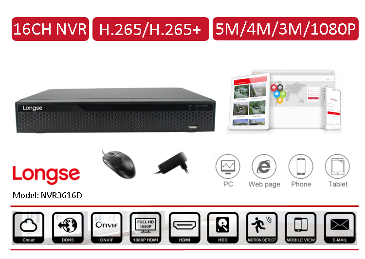 16-kanálový sieťový videorekordér pre IP kamery . Môžete si prezrieť obraz 16 kamier súčasne. Podporuje zobrazenie rozlíšenie 1920 × 1080 a nahrávanie až 2592 x 1944 . Zariadenie má 2 výstupy 1x VGA a 1x HDMI. Rekordér je pripojený na internet a umožňuje sledovanie obrazu kamier prostredníctvom mobilnej aplikácie na vašom smartfóne. Prístroj je vybavený 1 SATA konektorom - podporuje pevné disky až 8 TB a má 2x USB porty.