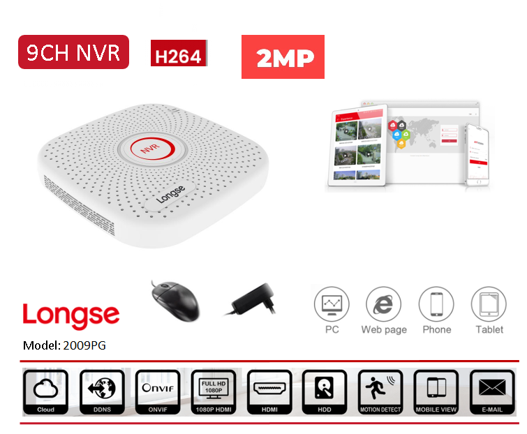 9-kanálový sieťový videorekordér pre IP kamery . Môžete si prezrieť obraz 9 kamier súčasne. Podporuje zobrazenie a nahrávanie v rozlíšení 1920 × 1080. Zariadenie má 2 výstupy 1x VGA a 1x HDMI. Rekordér je pripojený na internet a umožňuje sledovanie obrazu kamier prostredníctvom mobilnej aplikácie na vašom smartfóne. Prístroj je vybavený 1 SATA konektorom - podporuje pevné disky až 6 TB a má 2x USB porty.