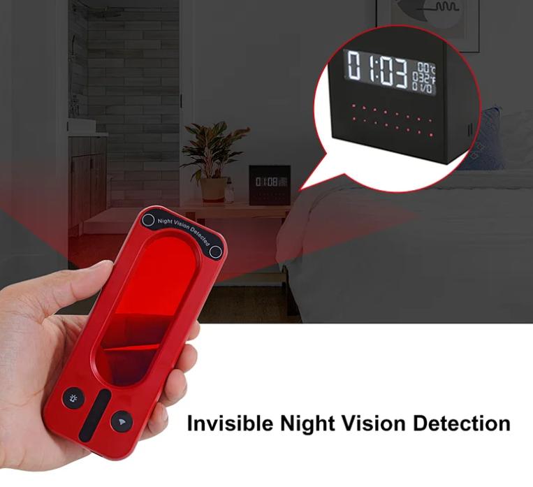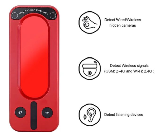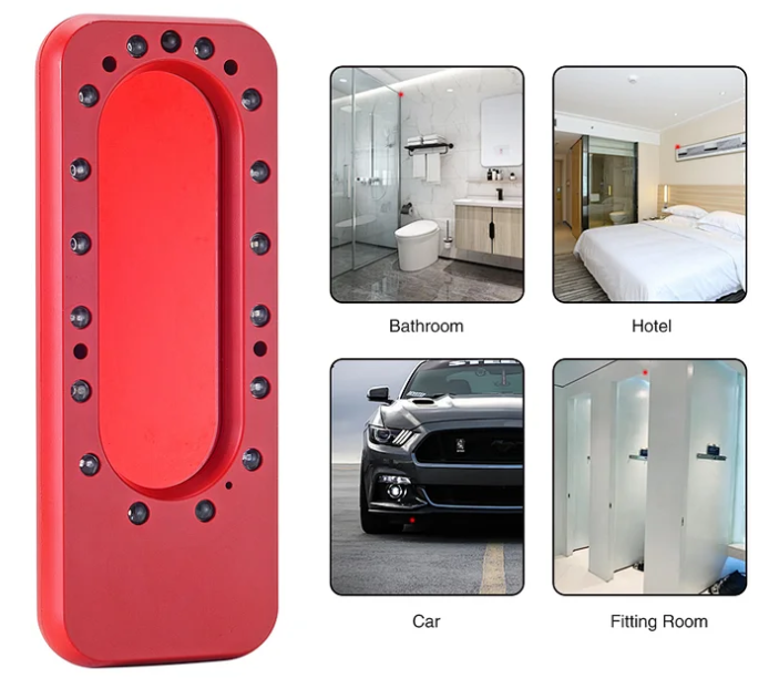 Predstavujeme Vám inovatívny Anti Spy RF detektor GSM odposluchov a skrytých kamier s nočným videním, ktorý sa od ostatných detektorov líši hlavne svojím vzhľadom a funkciami, ktoré ponúka. Pokiaľ ide o vzhľad, telo produktu je navrhnuté veľkou červenou farbou, vyzerá charakteristicky a celkom cool. Tento detektor GSM ploštíc sa používa na presnú detekciu rôznych skrytých špionážnych zariadení v okolitom prostredí. Ďalšou z funkcií je to, že dokáže detekovať akékoľvek skryté kamery s 940 neviditeľným nočným videním. Celkovo vzaté, tento Anti Spy RF detektor má funkciu detekcie bezdrôtovej kamery/bezdrôtovej špionážnej kamery na nočné videnie/GSM odpočúvacích zariadení. Je to vysokovýkonný profesionálny anti-spy detektor. Navyše má tento detektor mini rozmery, je vhodný na nosenie vo vrecku nohavíc, v náprsnom vrecku alebo v kabelke. Môžete ho využiť či už u Vás doma, v kancelárii, v hotelovej izbe, v aute alebo v skúšobnej kabínke na odhalenie skrytých kamier alebo GSM ploštíc. Anti Spy RF Detektor je dodávaný v praktickom anti-spy púzdre.