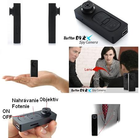 Kamera skrytá v gombíku je ideálnym pomocníkom pre video záznam so zvukom a je tak malá, že ju možno ukryť do kapsičky na košeli. Kamkoľvek umiestnite tento výrobok, budete si istí, že vám nič neunikne. Umožňuje nahrávať farebný videozáznam so zvukom (AVI), robiť fotografie (JPEG) . Jednotlivé videá sa ukladajú na pamäťovú kartu microSD (max. 8GB), ktorá nie je súčasťou dodávky. Pokiaľ dôjde k vybitiu batérie počas nahrávania, zariadenie súbor s nahrávkou najprv uloží a po tej sa vypne. Nabíjanie je možné vykonávať pomocou dodávaného USB portu.
