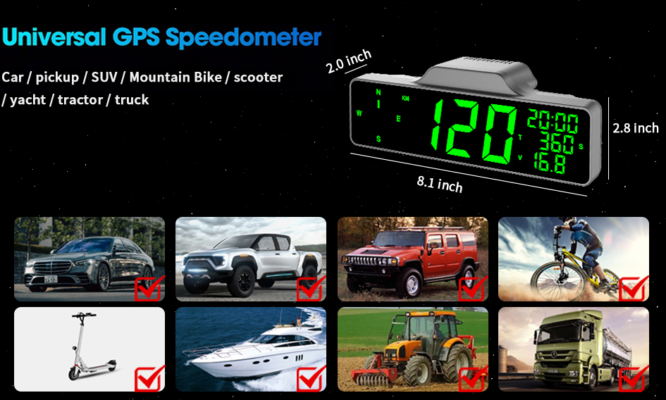 Multifunkčný GPS HUD rýchlomer do auta C3060 je univerzálny rýchlomer vhodný pre všetky vozidlá. GPS rýchlomer C3060 je 100% kompatibilný so všetkými vozidlami vrátane auta, nákladného auta, dodávky, SUV, skútra, vlaku, motocykla, bicykla, lode. Tento GPS HUD rýchlomer ukazuje nielen rýchlosť jazdy vozidla v čase, ale zobrazuje aj čas jazdy, najazdené kilometre, celkový počet najazdených kilometrov, miestny čas. Napätie autobatérie. Dá vám vedieť kľúčové informácie pre vašu cestu. Takisto má funkciu alarmu pri prekročení rýchlosti a funkciu alarmu únavy pri jazde. Údaje o rýchlosti a kompase pochádzajú zo satelitu, sú aktuálne a presné. Najmä smer kompasu je smerom jazdy, nie je ovplyvnený magnetickým poľom. Toto zariadenie nepotrebuje žiadne komplikované nastavovanie ani inštaláciu. GPS HUD má automatické nastavenie jasu pomocou snímača pre denné a nočné jazdy.