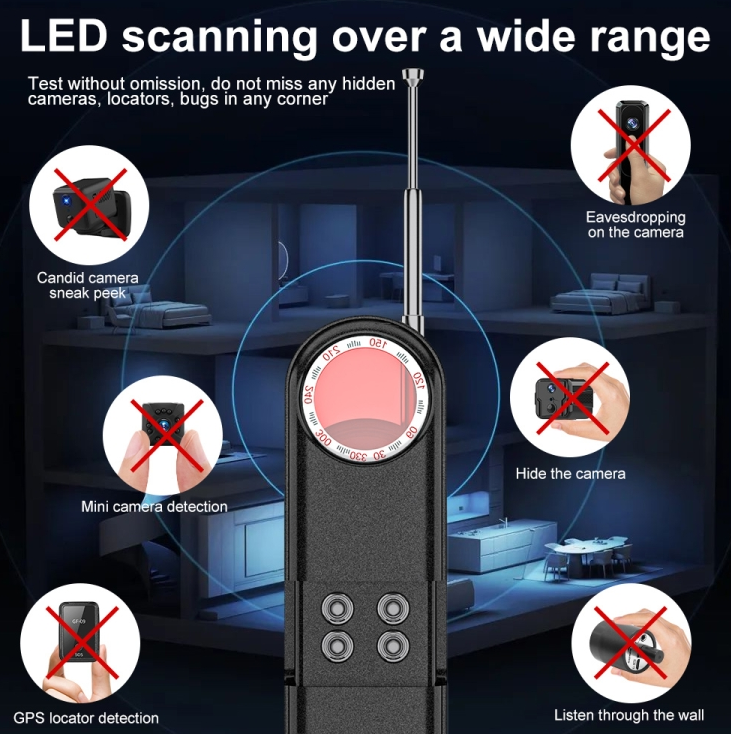 Nenápadný a ľahko prenosný Detekuje sktryté kamery Detekuje bezdrôtové signály (GSM: 2,4 G-4G a Wi-Fi: 2,4 GHz) Detekuje zariadenia na počúvanie Ľahký batériový pohon Profesionálne detekčné zariadenie, vysoká citlivosť Prenosný a napájaný batériami Extrémne jasné výkonné IR LED svetlá |