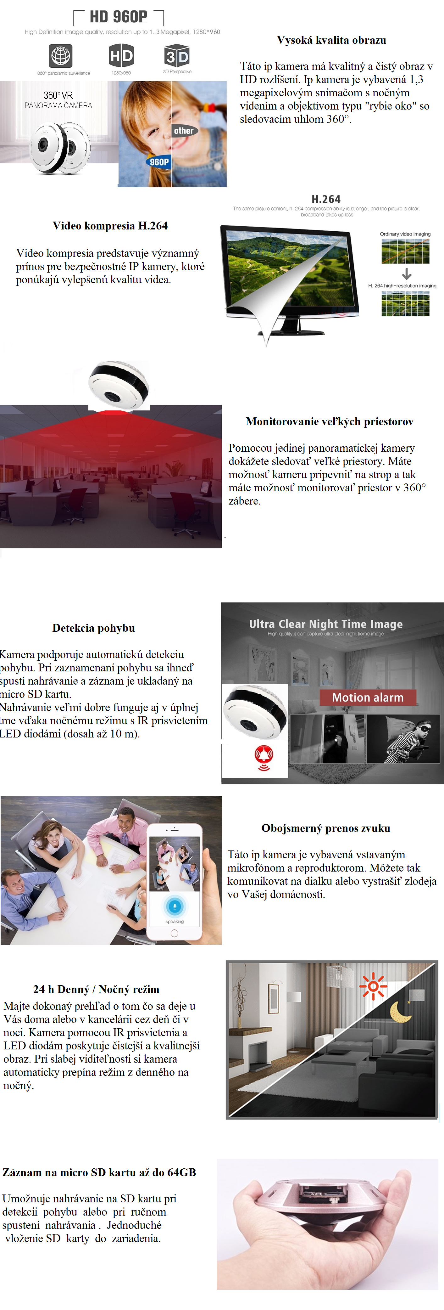 1,3 Megapixelový CMOS senzor zachytí každý detail Kamera je určená do všetkých vnútorných miestností Panoramatický objektív rybie oko - snímací uhol 360 ° (na strope) alebo 180 ° (na stene) Ovládanie pomocou mobilného telefónu (aplikácie pre Android, iOS) Online sledovanie nahrávania na vašom mobile Elektronická funkcia ePTZ (elektronické otáčanie, naklápanie a zoom bez pohyblivých častí) Automatická detekcia pohybu a auto-nahrávanie, pri pohybe Vás kamera informuje pomocou Wi-Fi na mobilný telefón a začne automatické nahrávanie na MicroSD kartu Obojsmerná zvuková komunikácia s vstavaným reproduktorom a mikrofónom IR LED pre nočné prísvit na vzdialenosť do 10 metrov Bohaté možnosti nastavenia obrazu a ďalších funkcií kamery Kvalitné spracovanie a pekný dizajn |