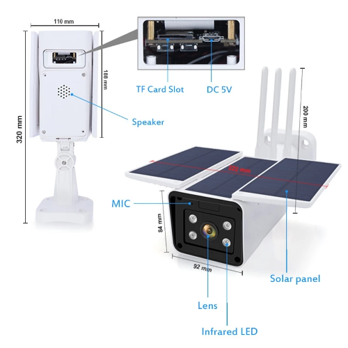 1 x Vonkajšia solárna Wi-Fi kamera 1 x Solárny panel s držiakom 1 x Sada skrutiek a hmoždiniek 1 x Nabíjací USB kábel 1 x Užívateľský manuál K tejto kamere je potrebná micro SD pamäťová karta