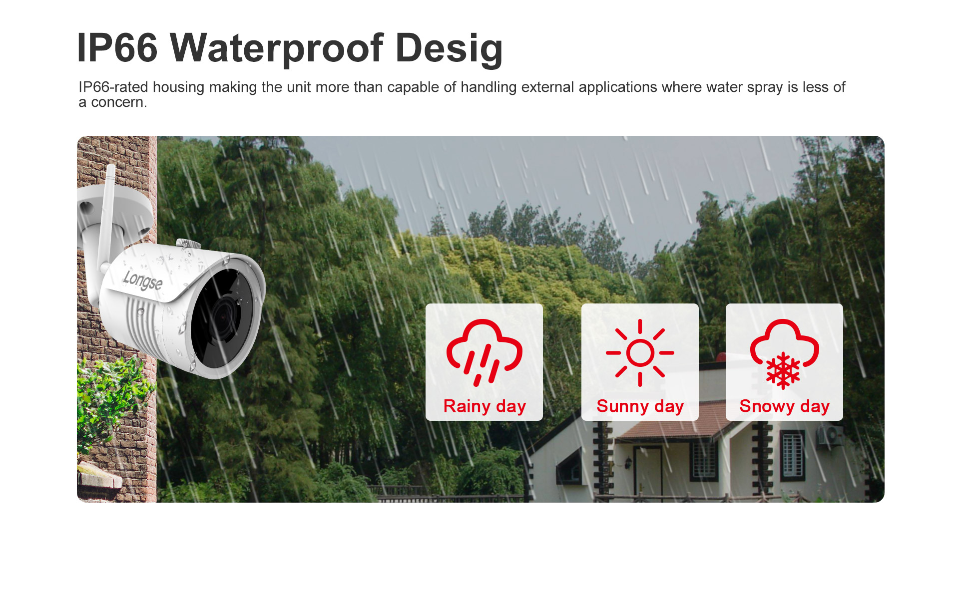 Kryt vonkajšej kamery je vybavený certifikátom IP66, ktorý chráni kameru pred nepriaznivým počasím ako je sneh, dážď, vietor. IP66 znamená, že je kamera prachotesná a vydrží priamo tryskajúcu vodu.