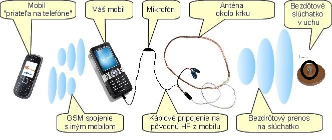 Vložte mikro slúchadlo opatrne do ucha. Uložené mikro slúchadlo v uchu je úplne neviditeľné. Slúchadlo sa umiestnuje priamo do zvukovodu, budete tak mať možnosť počuť jasne a zreteľne, čo váš priateľ hovorí na druhej strane telefónu. Toto slúchadlo je veľmi malé a preto zapadá hlboko do zvukovodu v blízkosti ušného bubienka (odporúčame nenahýnať hlavu príliš na stranu, aby sa zabránilo vypadnutiu slúchadla z ucha). Keď slúchadlo dosiahne správne hĺbku budete počujete zvuk (malý tresk) , to znamená, že slúchadlo sa dotklo ušného bubienka. Slúchadlo sa musí dotknúť vášho ušného bubienka, inak nebudete počuť žiadny zvuk alebo len nízky zvuk. Pre hlasnejší zvuk dajte jedno slúchadlo do ľavého ucha a ďalšie do pravého. Slúchadlá nie je možné v uchu spozorovať. Tieto slúchadlá nemajú batériu. Slúchadlo funguje ako rádio, ktoré príjma signál z transmitera (vysielača) vysiaceho na krku, ktorý sa napája dvoma 9V batériami. Schéma pripojenia je uvedená na obrázku: